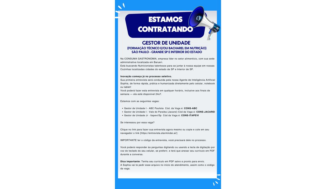 - Gestor de Unidade I - Região do ABC Paulista ------------------------ Código da Vaga é: CONS-ABC